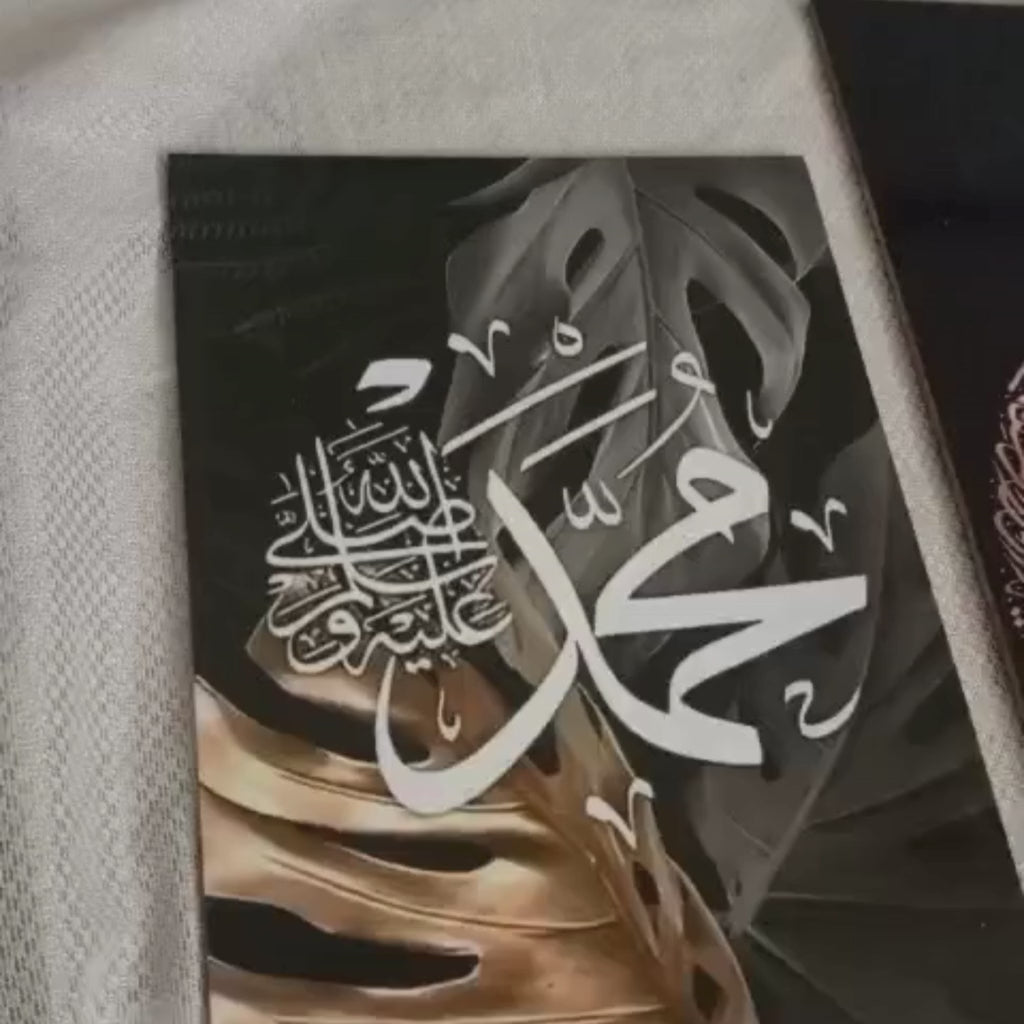 This set features Islamic calligraphy designed to strengthen the identity of a space through faith-centered decor. The wall art can be created with either “Allah and Muhammad” or “Allahu La ilaha illa Huwal Hayyul Qayyum” as the displayed text, depending on the selected design. Calligraphy adds purpose to an interior because calligraphy communicates meaning through script, layout, and contrast.