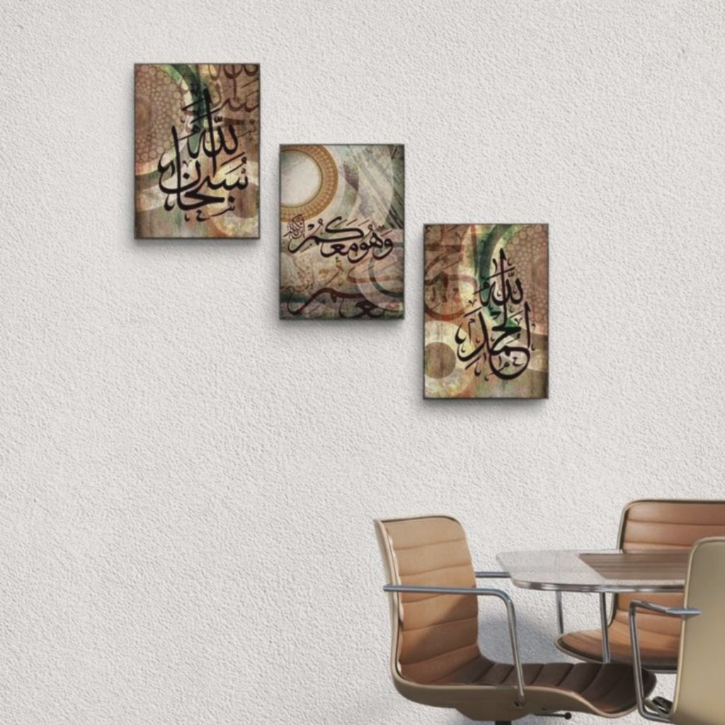 This Shopnow wall art set provides Islamic decor that combines Arabic calligraphy with a modern vertical layout. The set includes three 8×11 inch wooden photo tile frames. Each frame pairs a clear inscription with an abstract textured background. The result adds spiritual identity while maintaining a contemporary interior look.